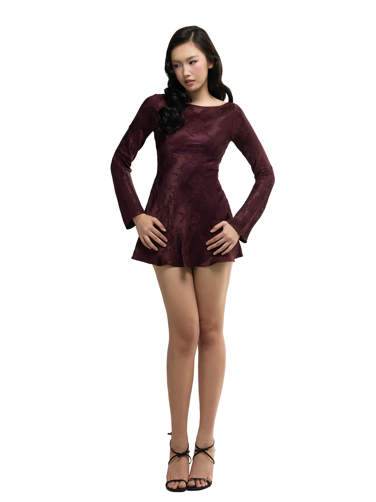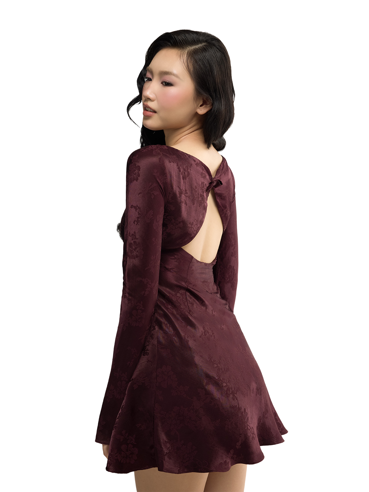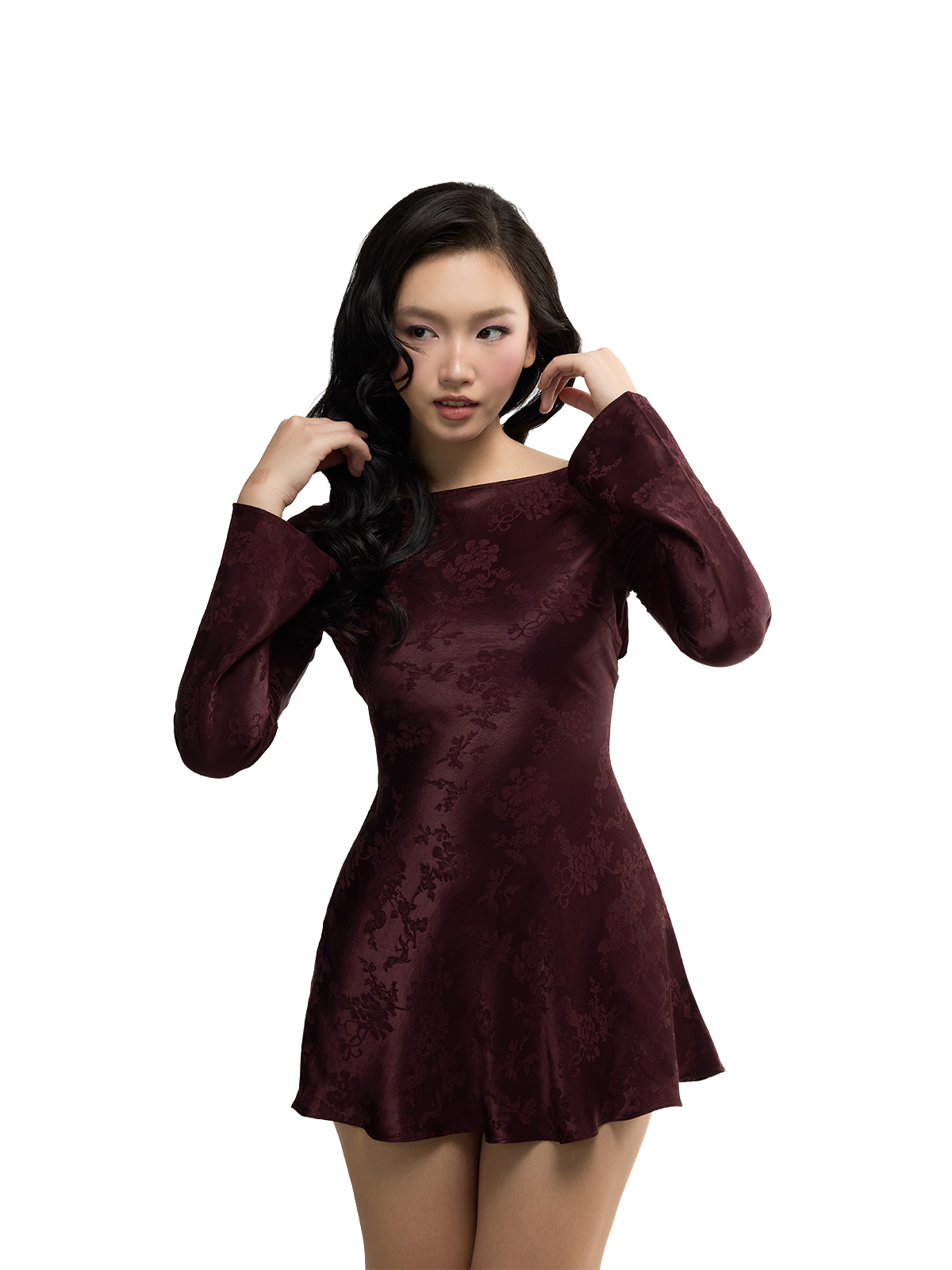 Magaret noir mini dress is made from silk satin jacquard with a soft texture and a gentle, natural shine. It fits comfortably through the body and falls into a light, slightly flared skirt that moves easily and feels flattering without being tight. The open back is finished with a small metallic hook detail that adds a quiet highlight. A hidden side zipper keeps the dress easy to slip into while maintaining a clean look.