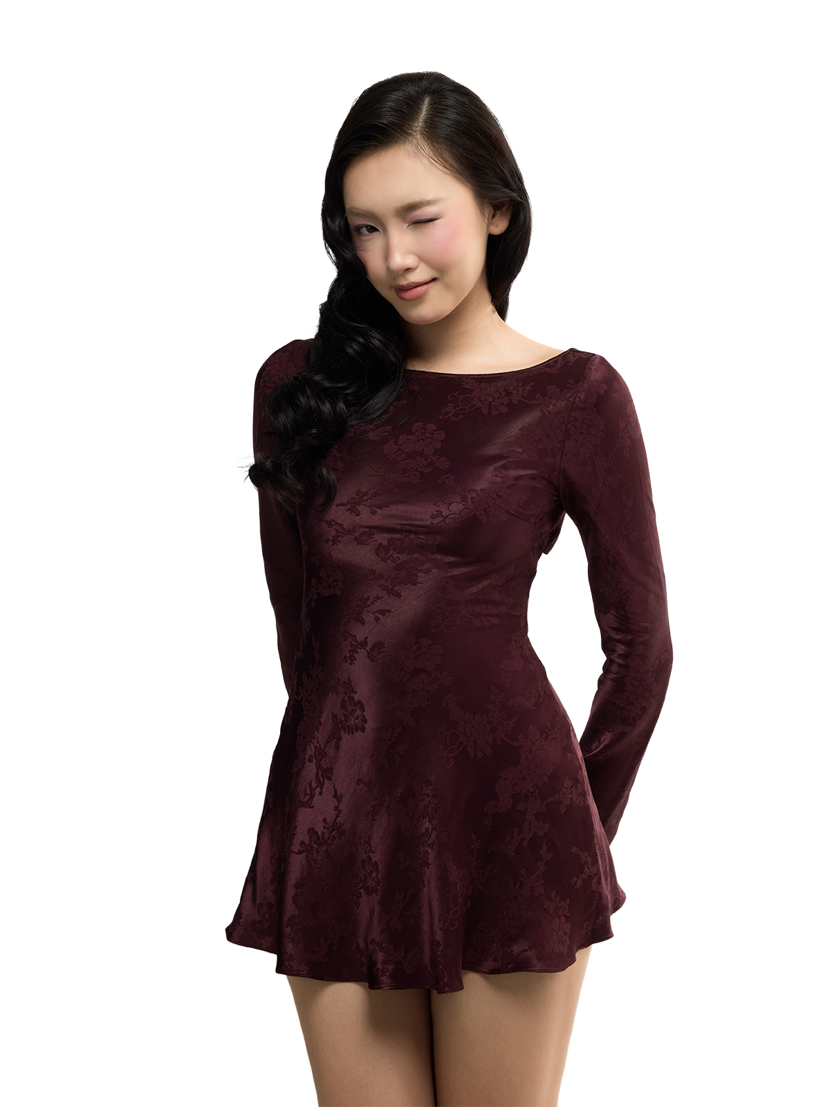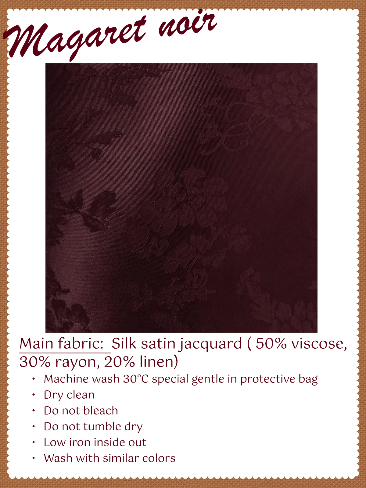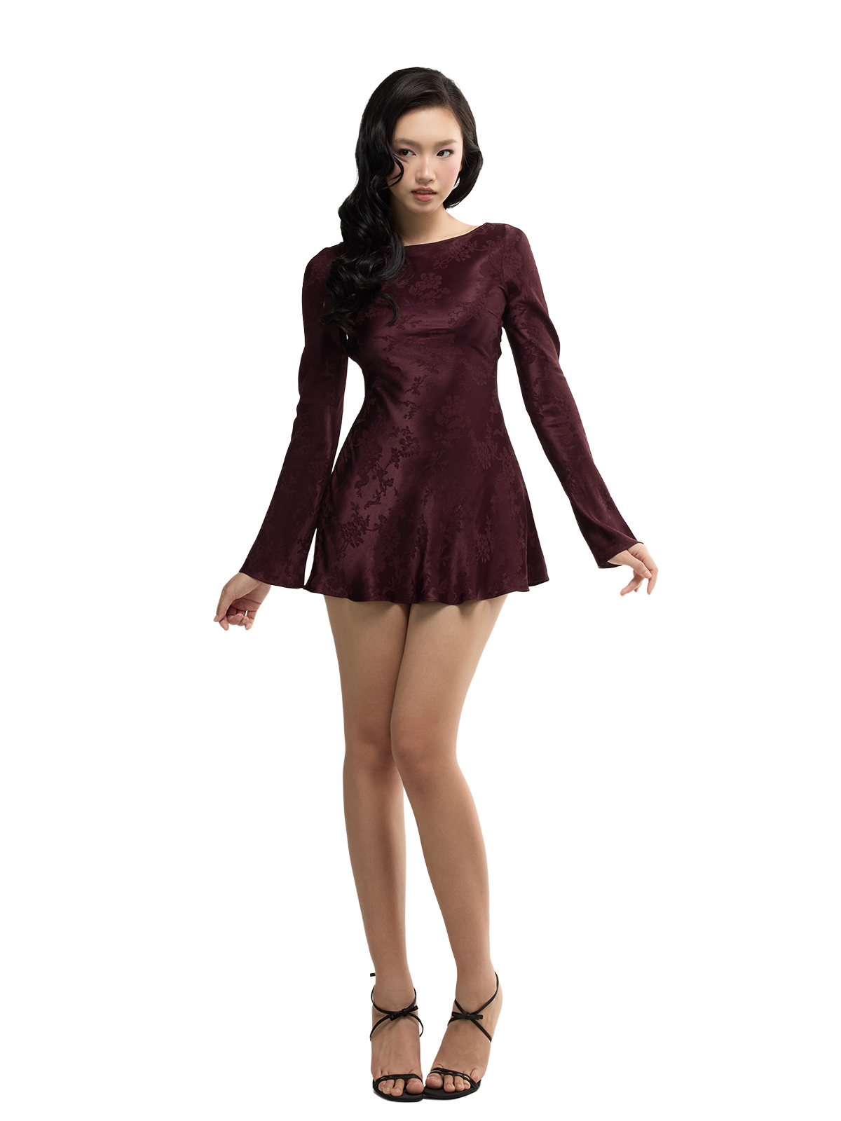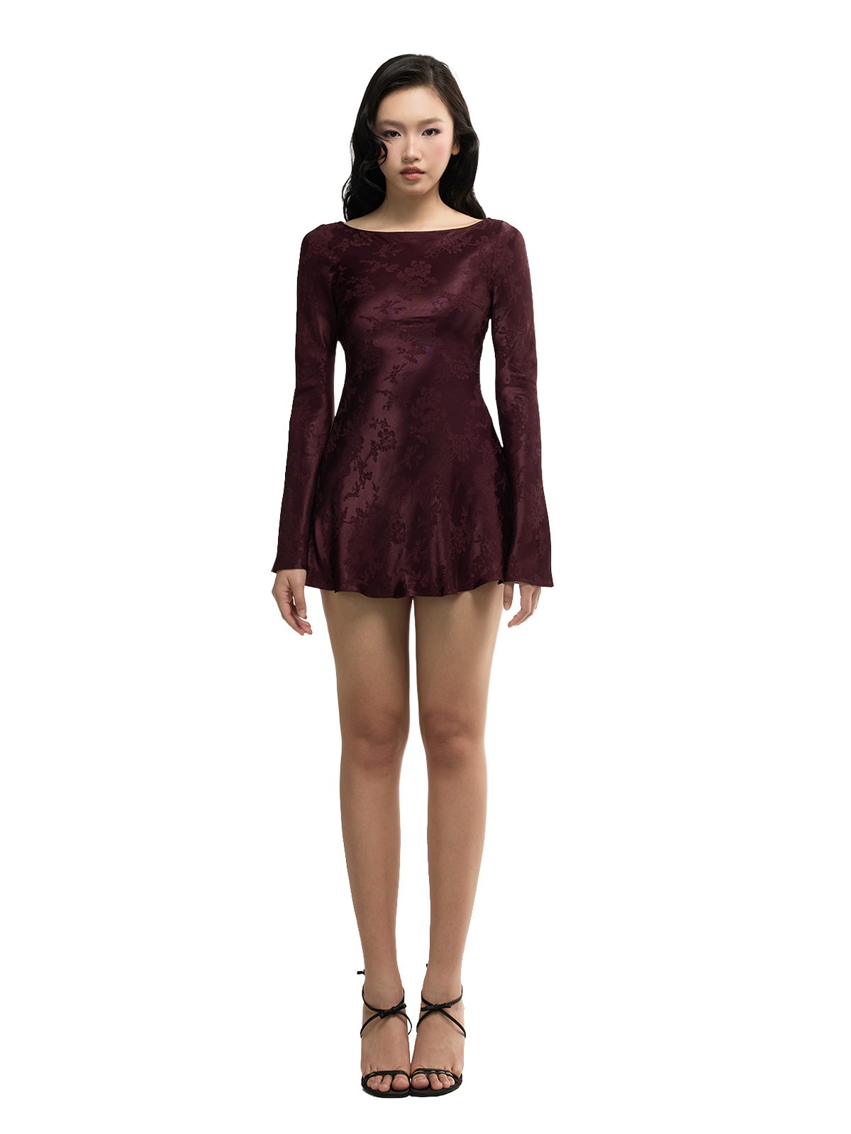 Magaret noir mini dress is made from silk satin jacquard with a soft texture and a gentle, natural shine. It fits comfortably through the body and falls into a light, slightly flared skirt that moves easily and feels flattering without being tight. The open back is finished with a small metallic hook detail that adds a quiet highlight. A hidden side zipper keeps the dress easy to slip into while maintaining a clean look.